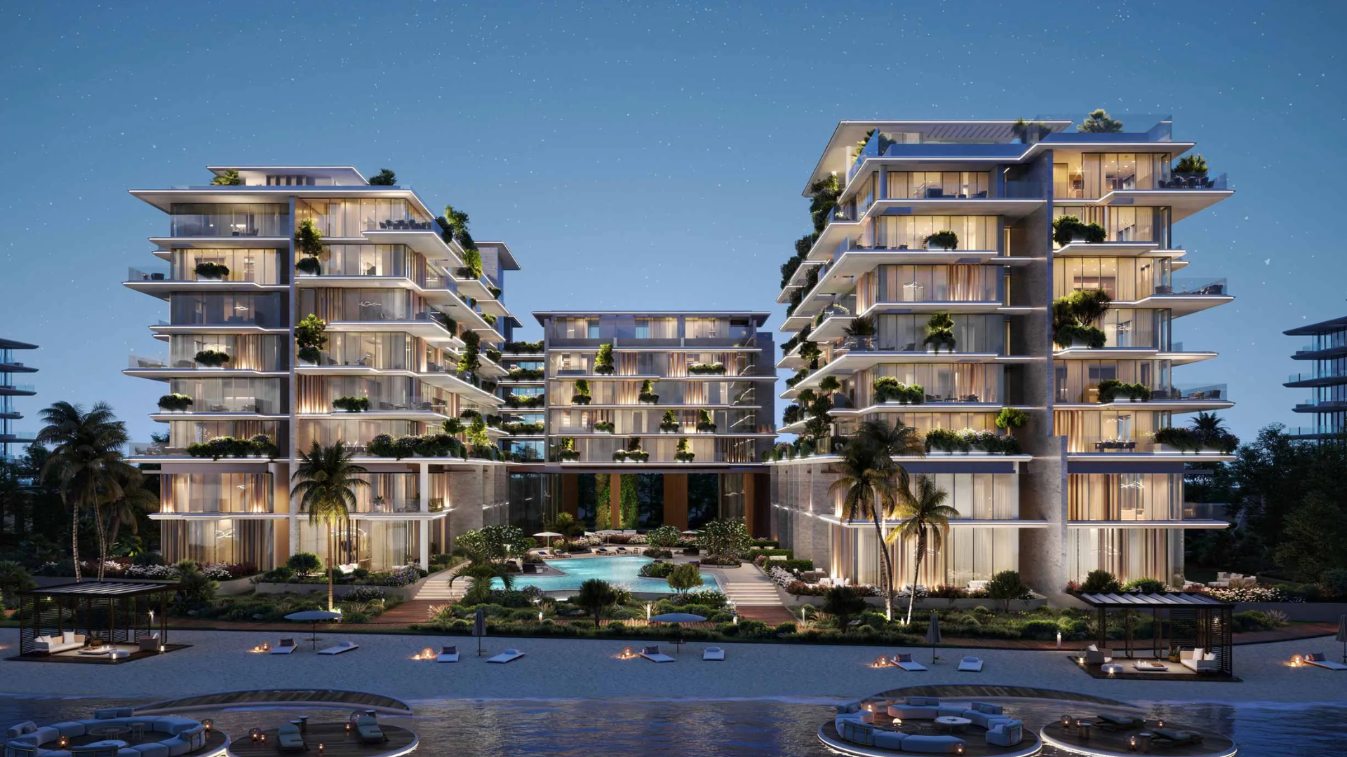 The development features 137 exquisite residences across two striking coastal buildings, including duplex townhouses, signature villas, sky penthouses, and 1–3 bedroom apartments. Homes showcase natural marble, wood, and stone finishes complemented by shimmering Murano glass accents, reflecting the beauty of the sea and the rhythm of the evening.