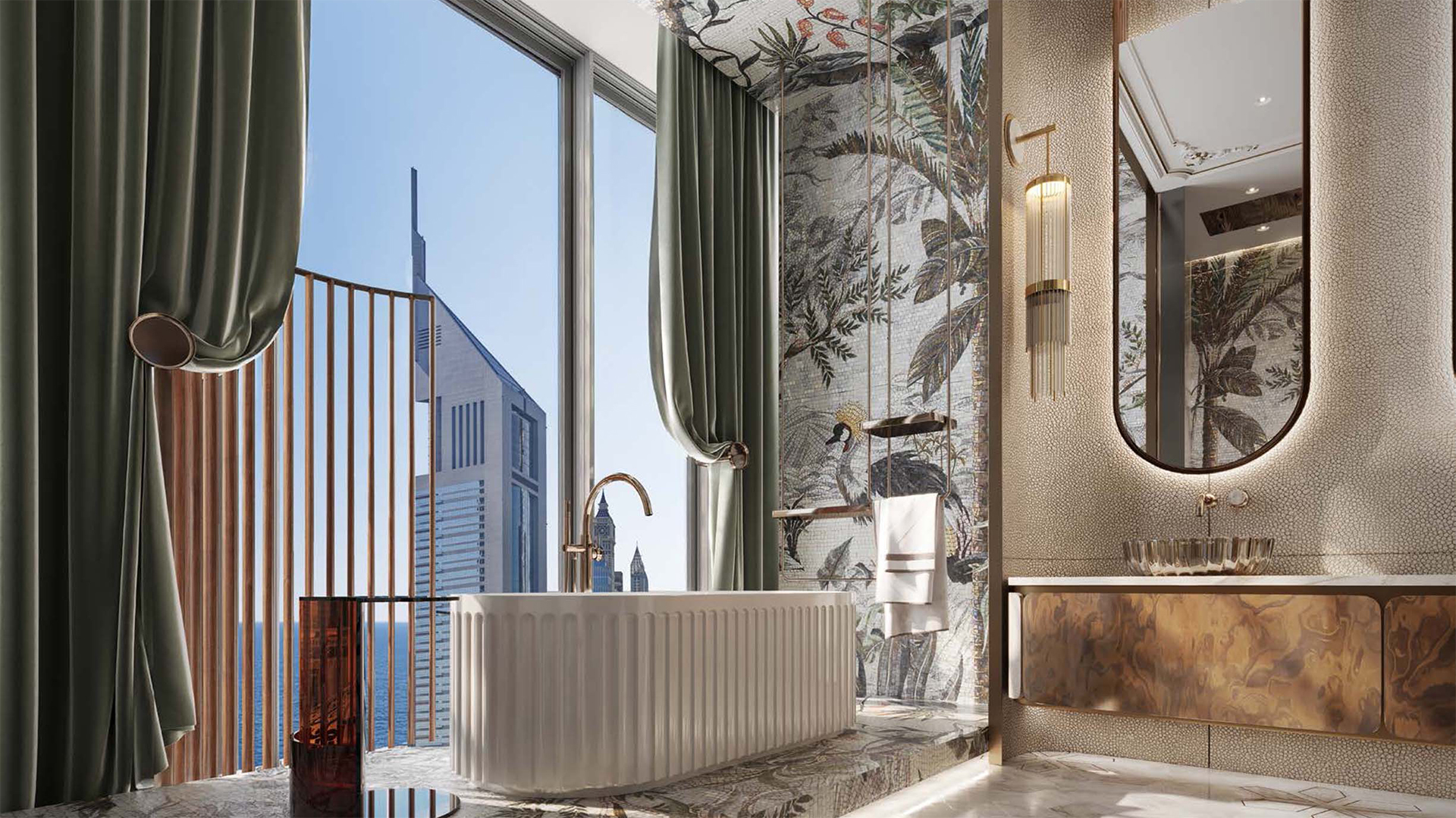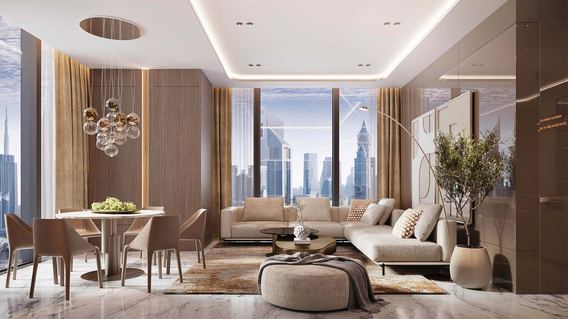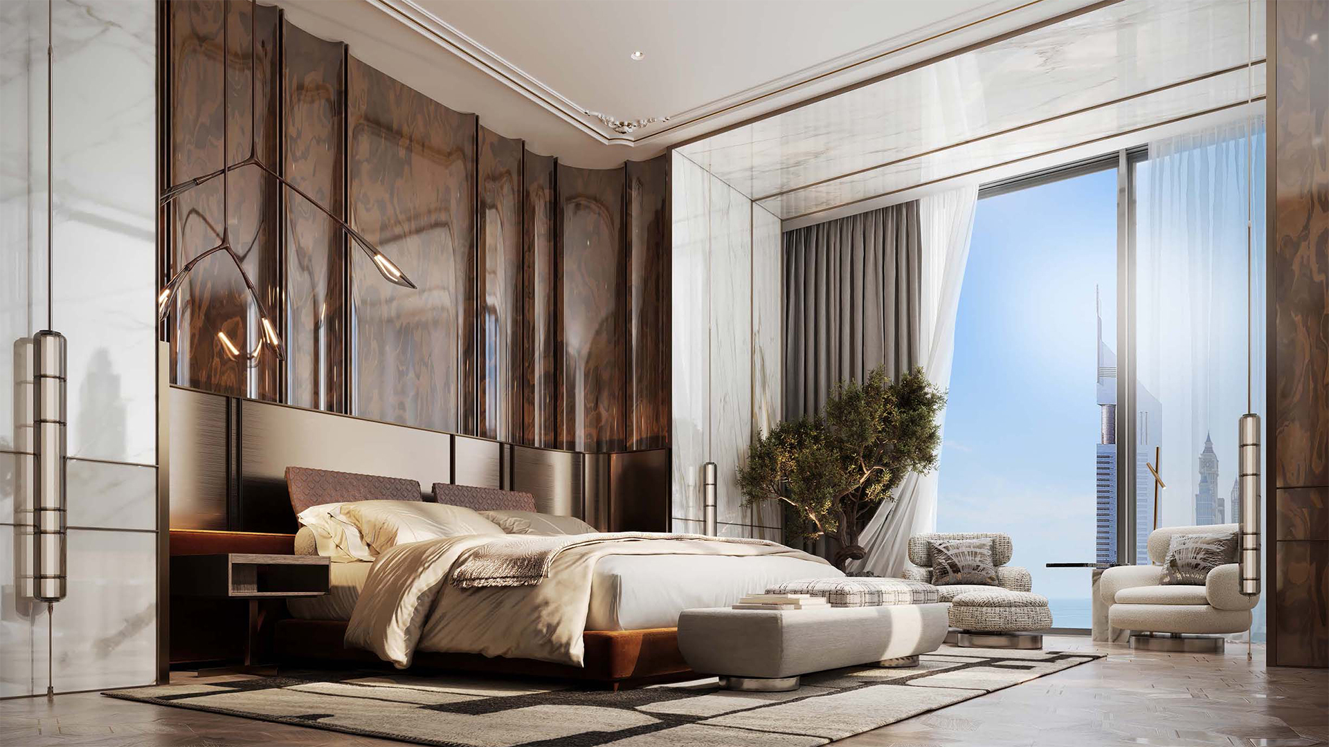 The property features an exclusive collection of luxury residences, including 1–3 bedroom apartments and opulent penthouses. Prices for a 1-bedroom apartment start at AED 8M (USD 2M), with a flexible 50/50 payment plan available for buyers.
