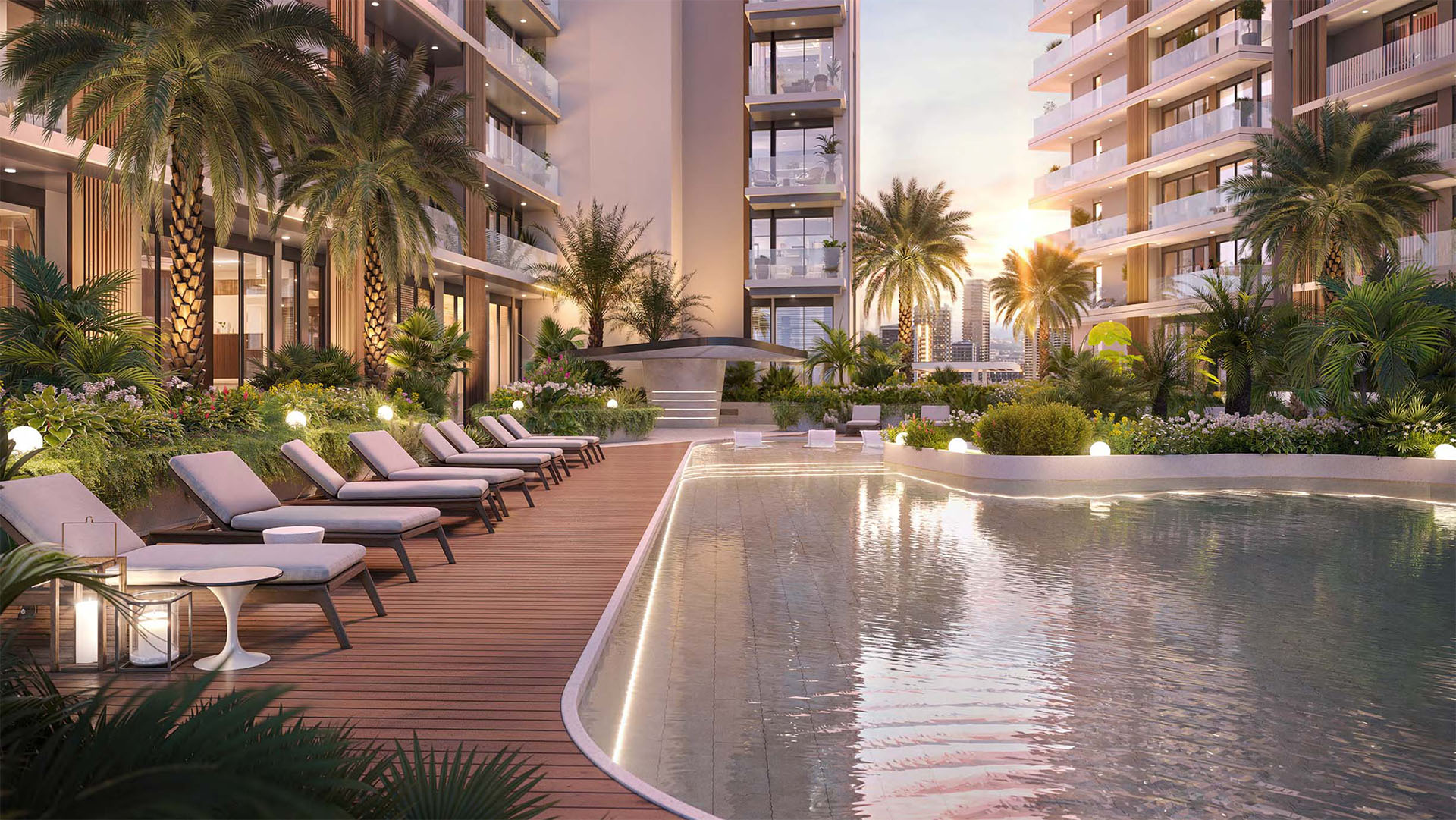 Prices start at AED 781K (USD 213K) for a 1-bedroom residence, with a 70/30 payment plan available. The infrastructure includes a luxury reception area, a leisure swimming pool, a club lounge, an indoor gym, yoga areas, an arcade room, a BBQ zone, and the Harmonic Hall.